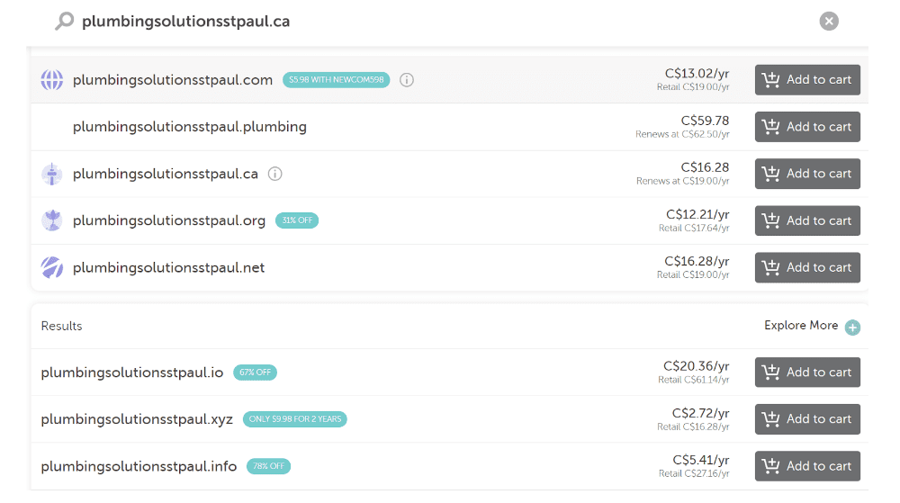 Let’s take a look at our friendly neighborhood plumber, Bob, and his search for a domain name. He wants to try, “plumbingsolutionsstpaul.ca”. We log into Namecheap and enter that name. These are the results: