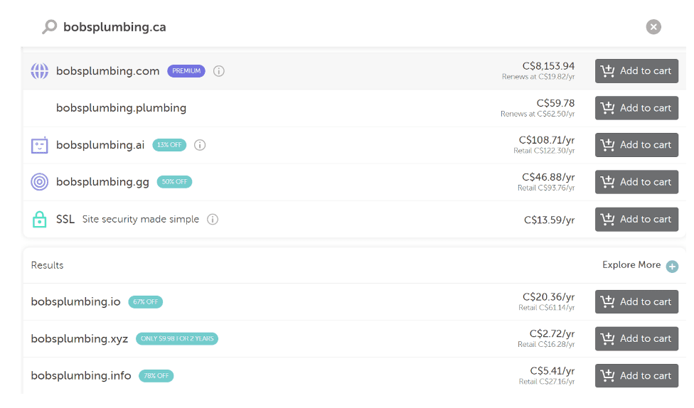 Let’s take a look and see what would happen if he wanted, “bobsplumbing.ca”: