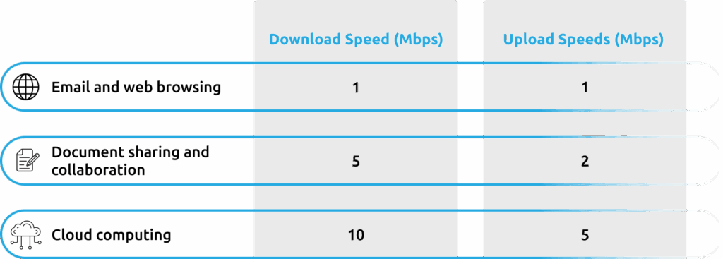 | Remote Work Activity | Download Speed (Mbps) | Upload Speed (Mbps) |